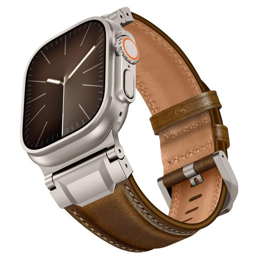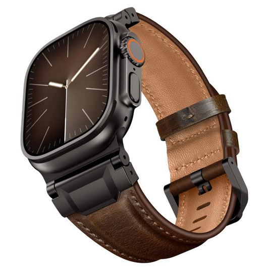 For Apple Watch 46mm / 49mm / 45mm / 44mm Armour-style Leather Watch Band(New Dark Brown Crazy Horse Titanium Buckle)