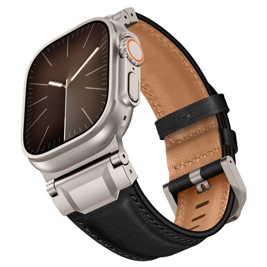 For Apple Watch 46mm / 49mm / 45mm / 44mm Armour-style Leather Watch Band(Black Nappa Leather Titanium Buckle)