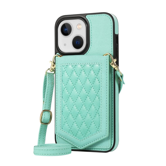 For iPhone 13 mini Rhombic Texture RFID Phone Case with Lanyard & Mirror(Mint Green)