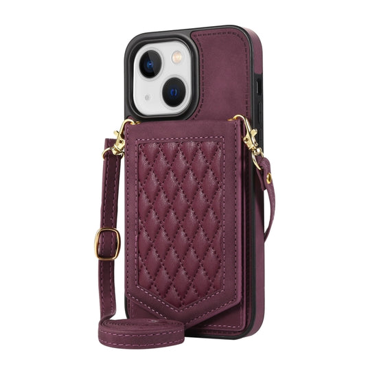 For iPhone 13 mini Rhombic Texture RFID Phone Case with Lanyard & Mirror(Wine Red)