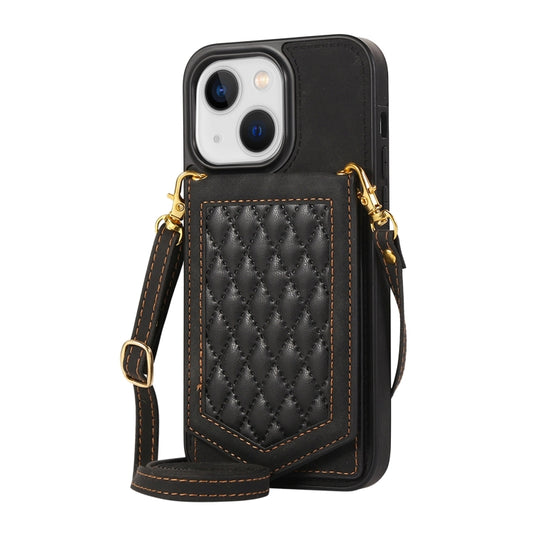 For iPhone 13 mini Rhombic Texture RFID Phone Case with Lanyard & Mirror(Black)