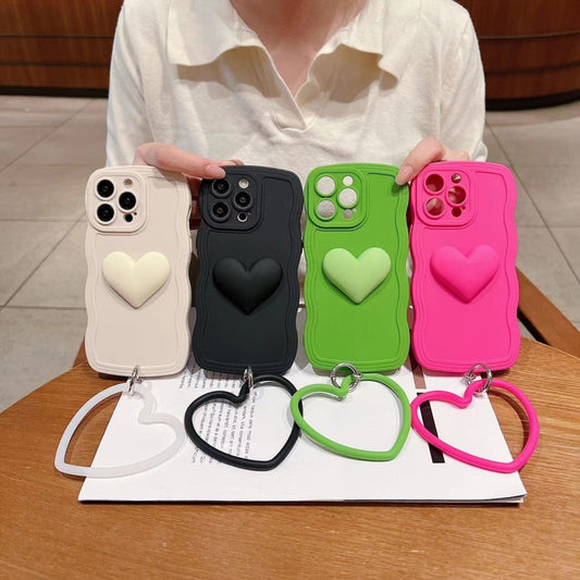 For iPhone 13 mini 3D Heart Skin-Feel Silicone Phone Case with Wristband(Green)