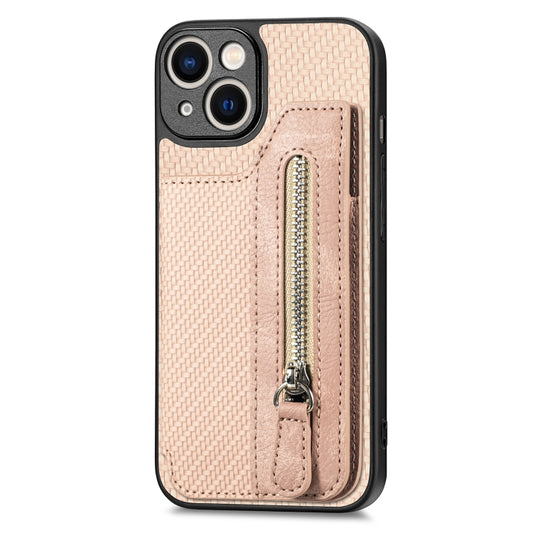 For iPhone 13 mini Carbon Fiber Horizontal Flip Zipper Wallet Phone Case(Khaki)