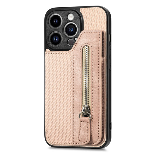 For iPhone 13 Pro Max Carbon Fiber Horizontal Flip Zipper Wallet Phone Case(Khaki)