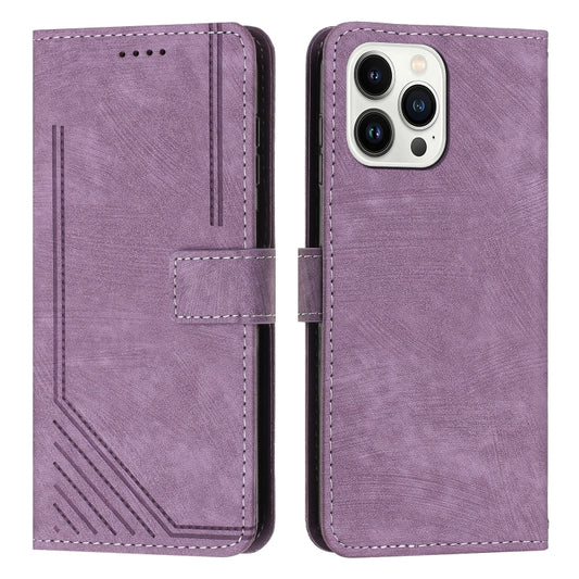 For iPhone 14 Pro Max Skin Feel Stripe Pattern Leather Phone Case with Lanyard(Purple)