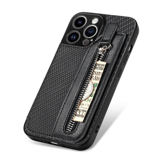 For iPhone 14 Pro Max Carbon Fiber Horizontal Flip Zipper Wallet Phone Case(Black)