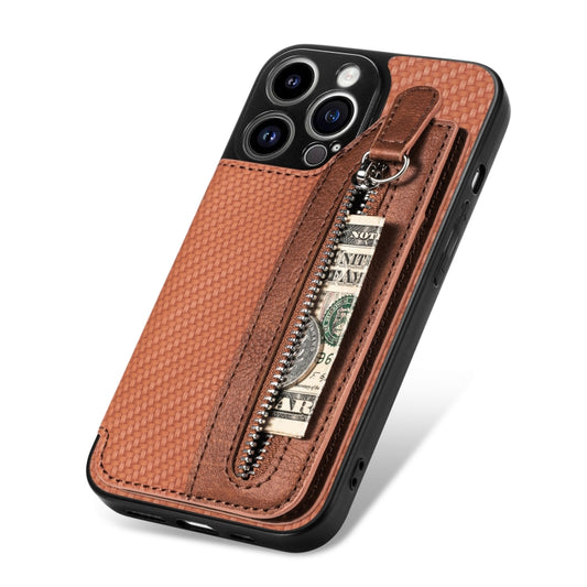For iPhone 14 Pro Max Carbon Fiber Horizontal Flip Zipper Wallet Phone Case(Brown)