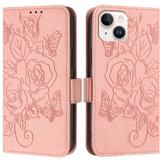 For iPhone 15 Embossed Rose RFID Anti-theft Leather Phone Case(Pink)