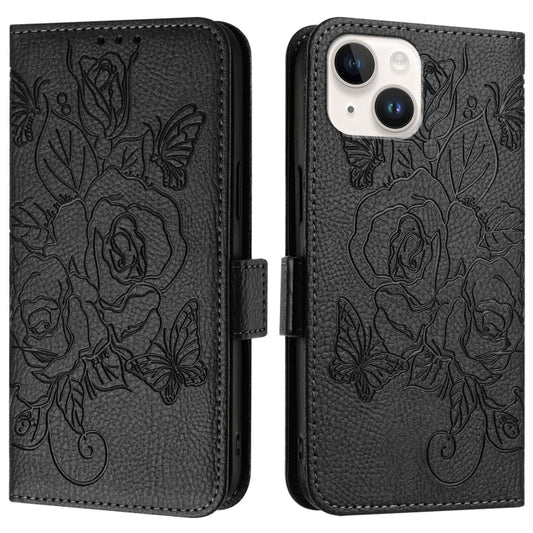 For iPhone 15 Embossed Rose RFID Anti-theft Leather Phone Case(Black)