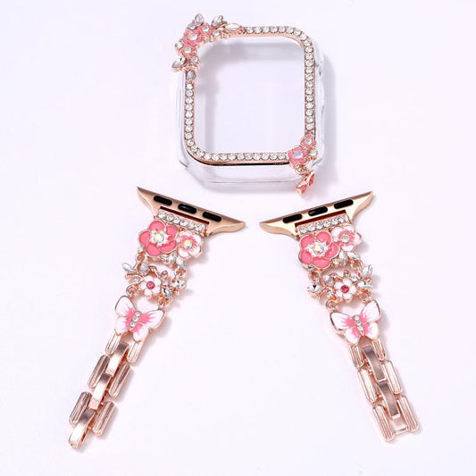 For Apple Watch Series 9 / 8 / 7 44mm Tassel Flower Single-Diamond Hollow Watch Shell Band Kit(Rose Gold)