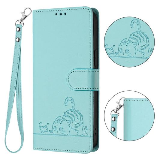 For iPhone 15 Cat Rat Embossed Pattern RFID PU Phone Case with Wrist Strap(Mint Green)