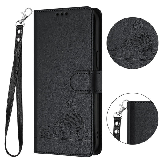 For iPhone 15 Cat Rat Embossed Pattern RFID PU Phone Case with Wrist Strap(Black)