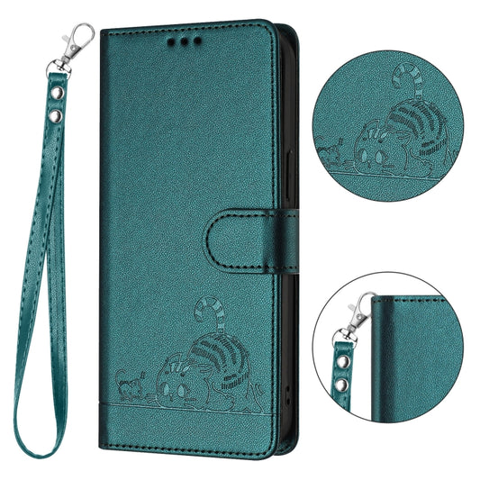 For iPhone 15 Cat Rat Embossed Pattern RFID PU Phone Case with Wrist Strap(Peacock Green)