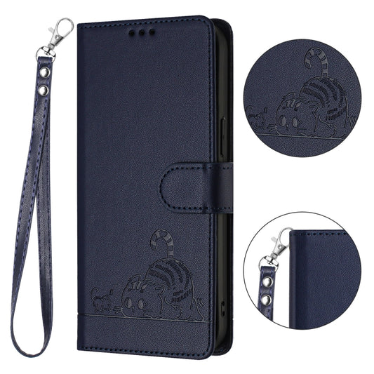 For iPhone 15 Cat Rat Embossed Pattern RFID PU Phone Case with Wrist Strap(Blue)