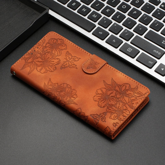 For iPhone 15 Cherry Blossom Butterfly Skin Feel Embossed PU Phone Case(Brown)