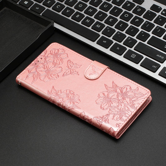 For iPhone 15 Cherry Blossom Butterfly Skin Feel Embossed PU Phone Case(Rose Gold)