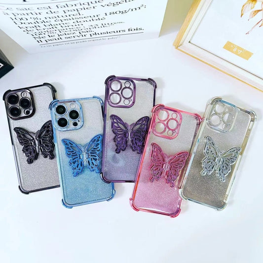 For iPhone 15 Electroplated Glitter 3D Butterfly Four-corner Shockproof TPU Phone Case(Gradient Blue)