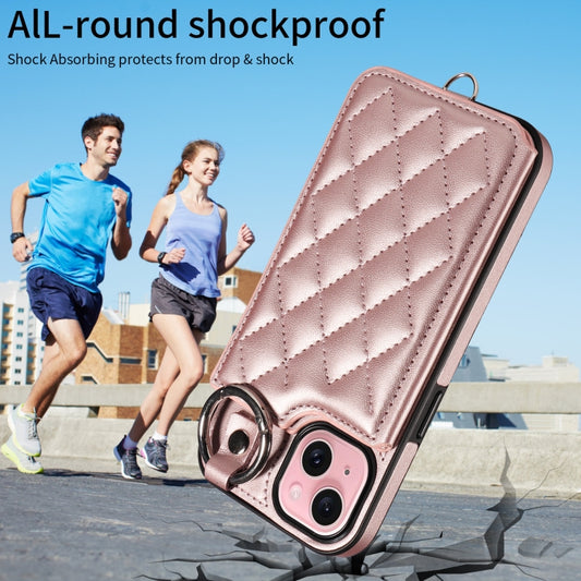 For iPhone 15 Rhombic Texture Card Bag Phone Case with Short Lanyard(Rose Gold)