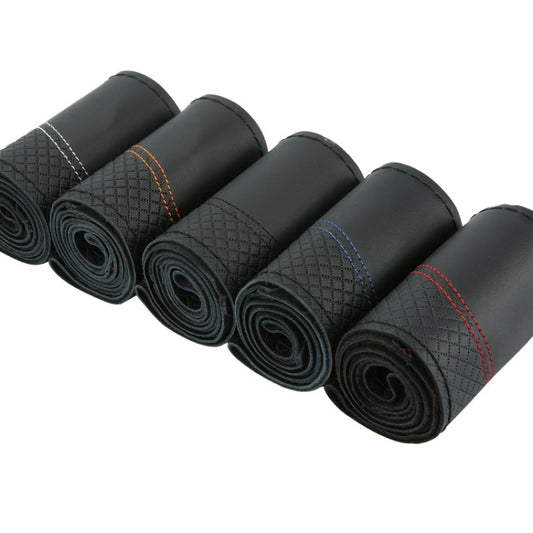 38cm Four-Season Embossed Hand-Sewn Cowhide Steering Wheel Cover(Black+Red Line)