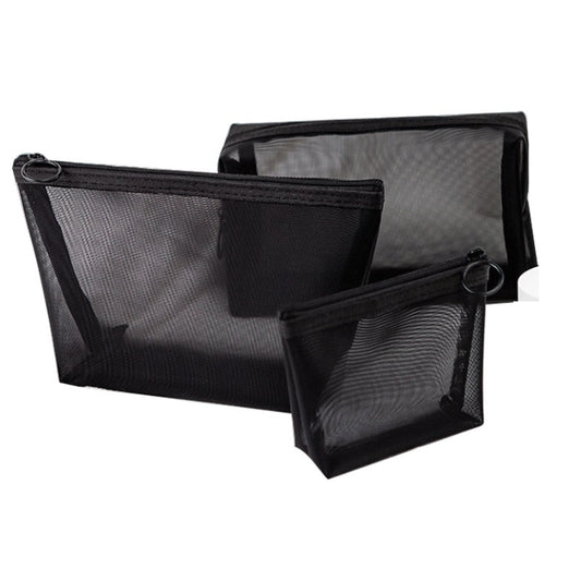 Trousse de maquillage en maille transparente noire, trousse de rangement de voyage de grande capacité en trois pièces (trois pièces)