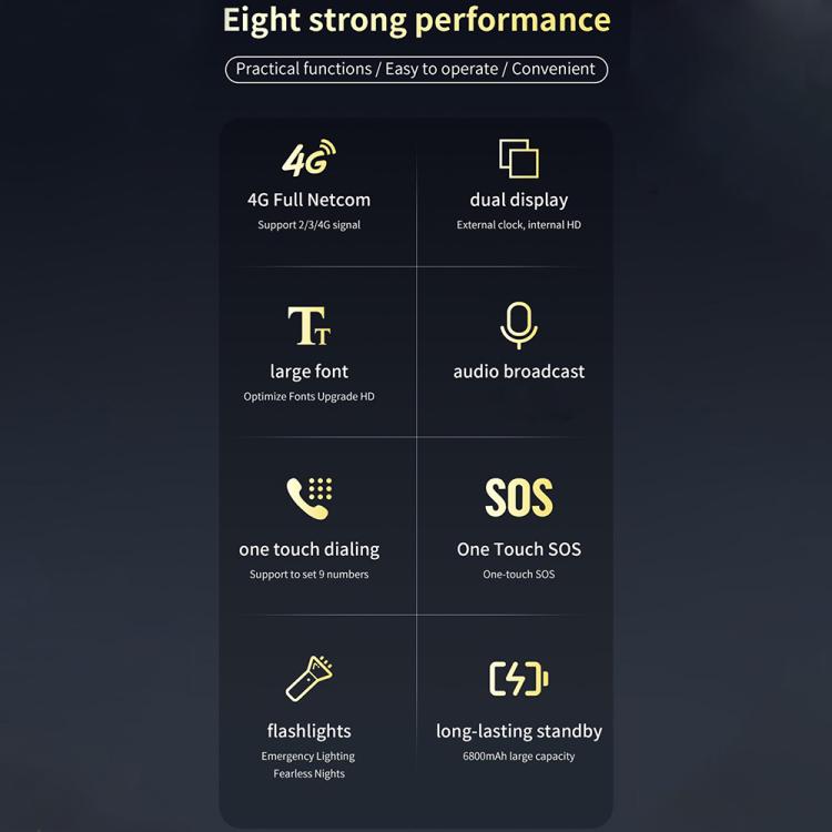 15. Functions: Camera, video recording, video playback, music playback, recording, FM radio, Bluetooth, alarm clock, calculator, calendar, SOS supports 5 groups, family dialing/quick dialing: 9 groups, social software: Browser, facebook, whatsapp; Triple-proof appearance, dual large screens (2.8 inch + 2.4 inch), large buttons, shortcut buttons, side button one-touch flashlight switch, large speaker with loud sound, large battery, long standby, loud earpiece, vibration, flashlight, large font; Can store 100 mobile phone numbers and 200 text messages. Long press the 0 key for SOS emergency call, long press the # key to switch between vibration, music and silent modes