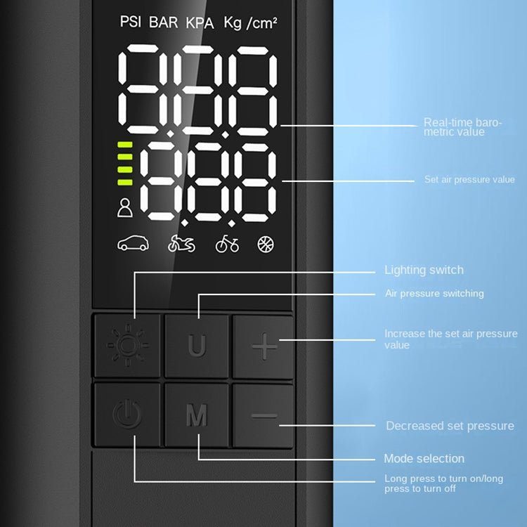 4. The tire pressure can be set in advance. After setting, the inflation reaches the preset value, and the inflation pump will automatically stop inflating, which is convenient and fast.
