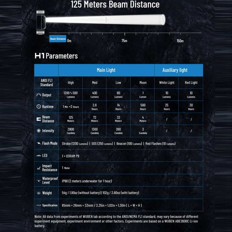 1. The high-lumen headlight uses OSRAM P9 LED, the brightness is 1200 lumens, the light-emitting angle is 100 degrees, and the beam length is 125 meters.