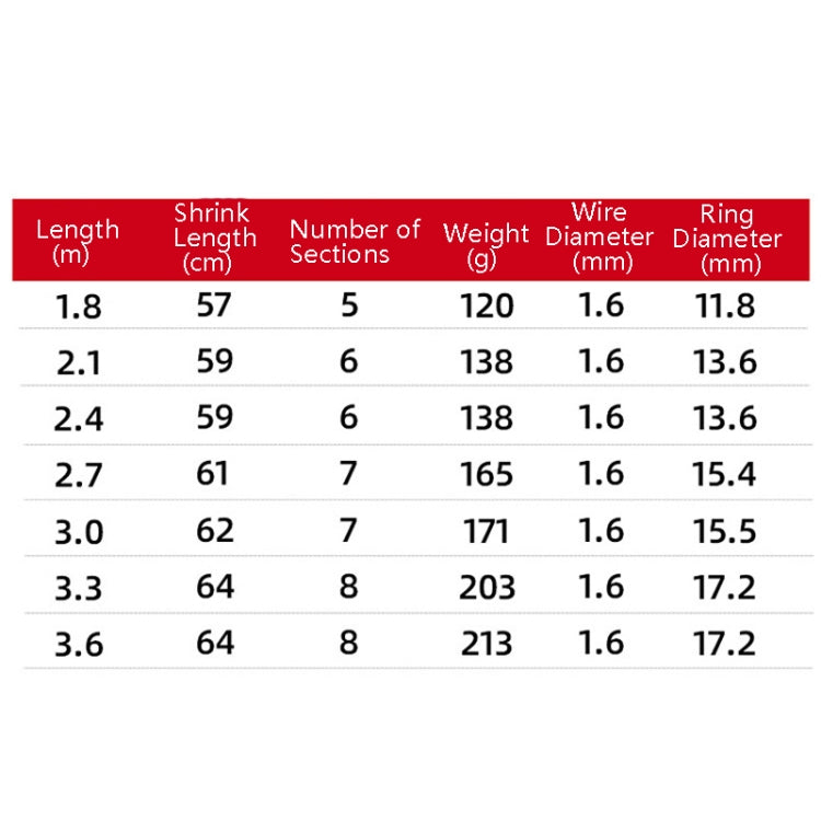 5. Weight: about 120g for 1.8m, about 138g for 2.1/2.4m, about 165g for 2.7m, about 171g for 3.0m, about 203g for 3.3m, and about 213g for 3.6m.