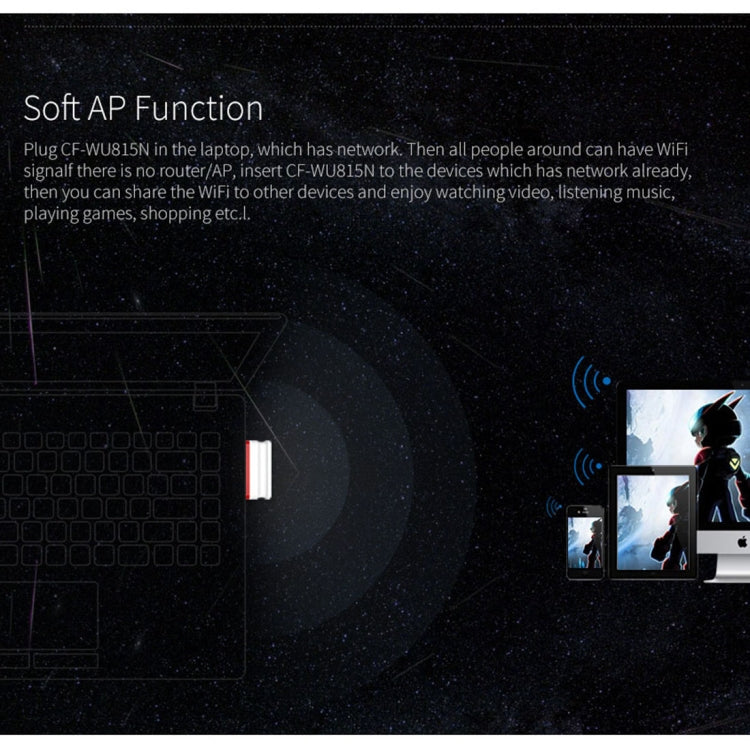 3. Plug CF-WU815N in the laptop, which has network, then all people around can have WiFi signal.