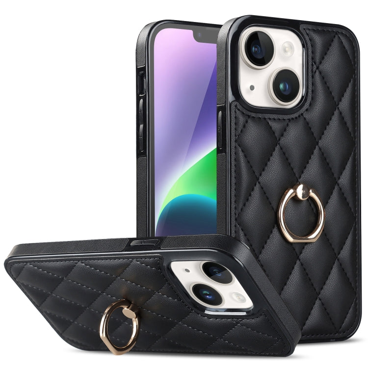 For iPhone 14 Plus Rhombic PU Leather Phone Case with Ring Holder(Black)