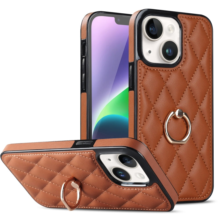 For iPhone 14 Plus Rhombic PU Leather Phone Case with Ring Holder(Brown)