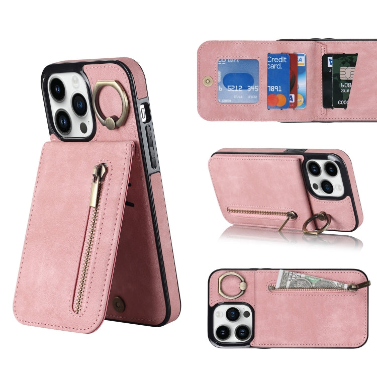 For iPhone 14 Retro Ring and Zipper RFID Card Slot Phone Case(Pink)