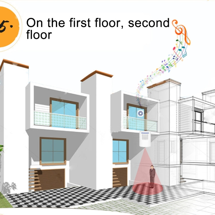 6. Adjust the angle of the sensor to a suitable position, when the guest enters its detection range, the receiver automatically sends sweet music ringtones, the red LED lights
