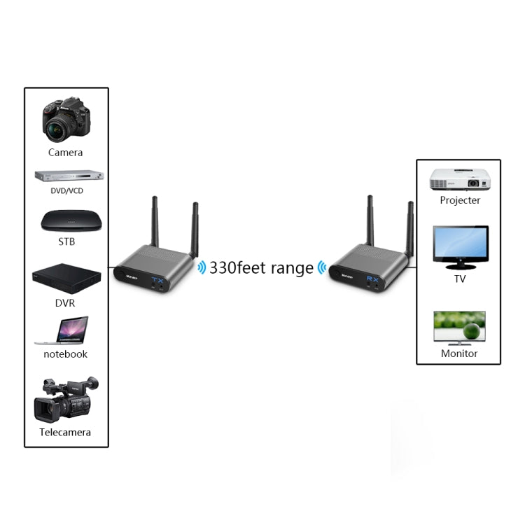 1. The wireless HDMI extender extends high-definition video and audio to any HDTV displays up to 330 feet away. It supports up to 4 displays to show one source content synchronously and resolutions up to 1080P.