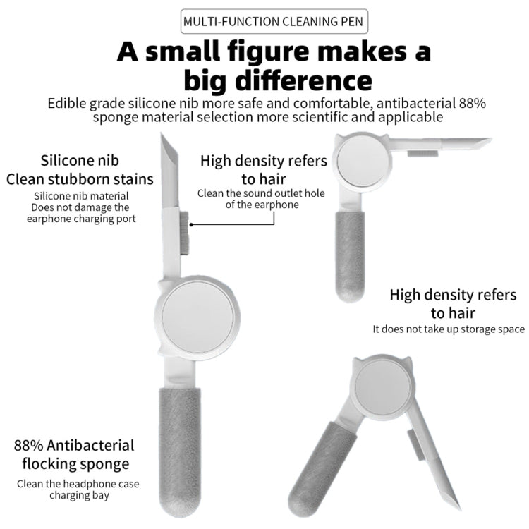 2. The silicone tip can remove stubborn stains in the crevices of earphones, buttons and other items. High-density brushes remove dirt and dust from the sound holes of the headphones. The flocking sponge removes the dust inside the earphone charging case.