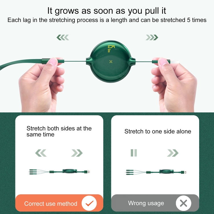 WK WDC-124 3A 3 In 1 8 Pin + Type-C / USB-C + Micro USB Bona Series Telescopic Charging Data Cable, Length: 1.5m (Green)